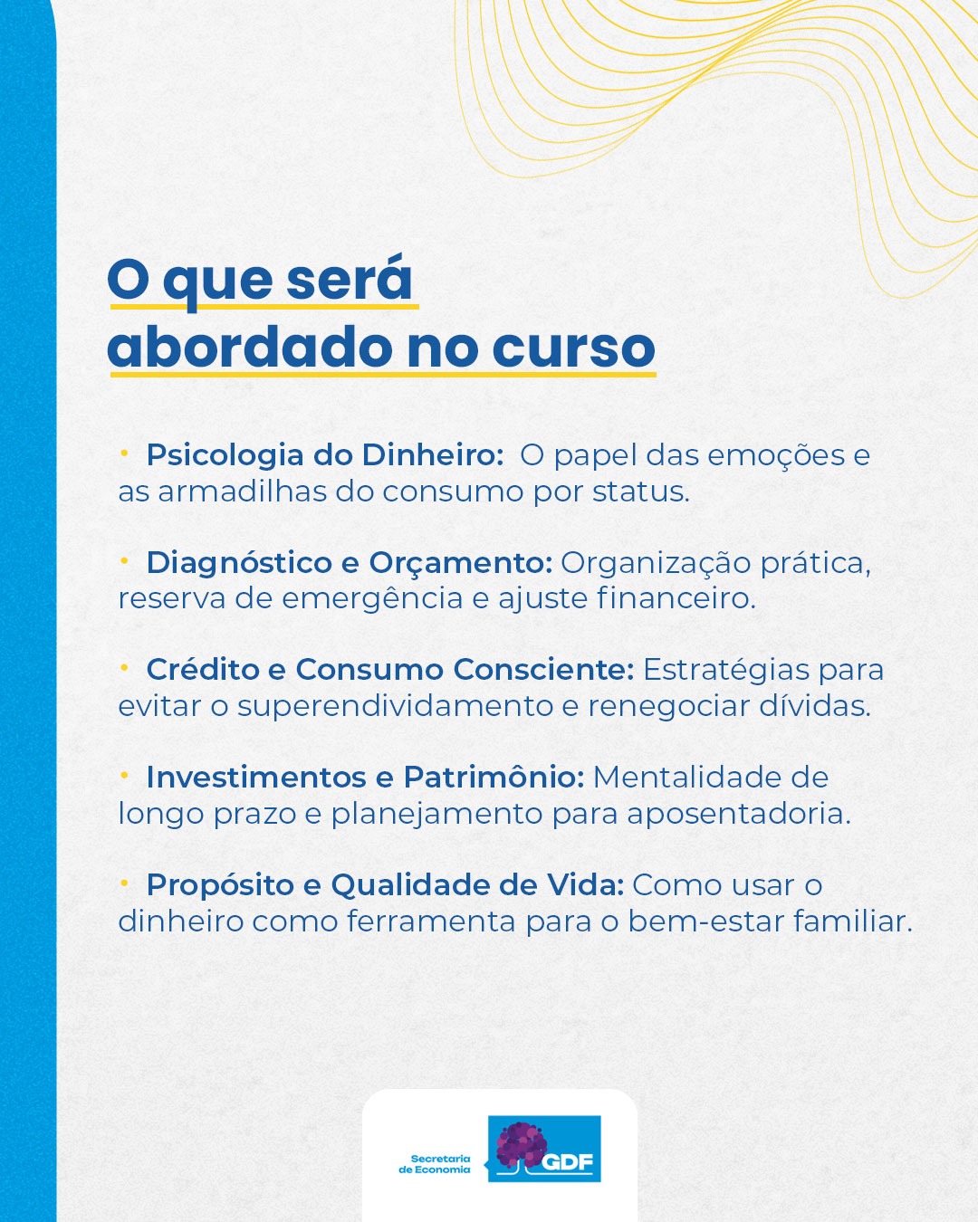 O curso é presencial e terá abordagem teórico-prática, com exposição dialogada de conceitos, estudos de caso reais, dinâmicas sobre comportamento financeiro e exercícios de diagnóstico e planejamento. Também estão previstas simulações práticas e a construção de um plano financeiro pessoal ao longo das atividades.