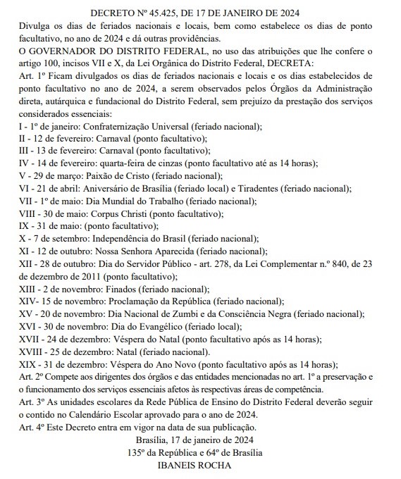 As datas de feriados e pontos facultativos para o ano de 2024 foram divulgadas pelo Governo do Distrito Federal (GDF), nesta quinta-feira (18). Publicado no Diário Oficial do DF, o Decreto nº 45.425, de 17 de janeiro de 2024 aponta os feriados nacionais e locais, assim como os dias estabelecidos de ponto facultativo deste ano. O calendário contempla, ao todo, 19 datas, incluindo o carnaval, o aniversário de Brasília e o Natal, entre outras.