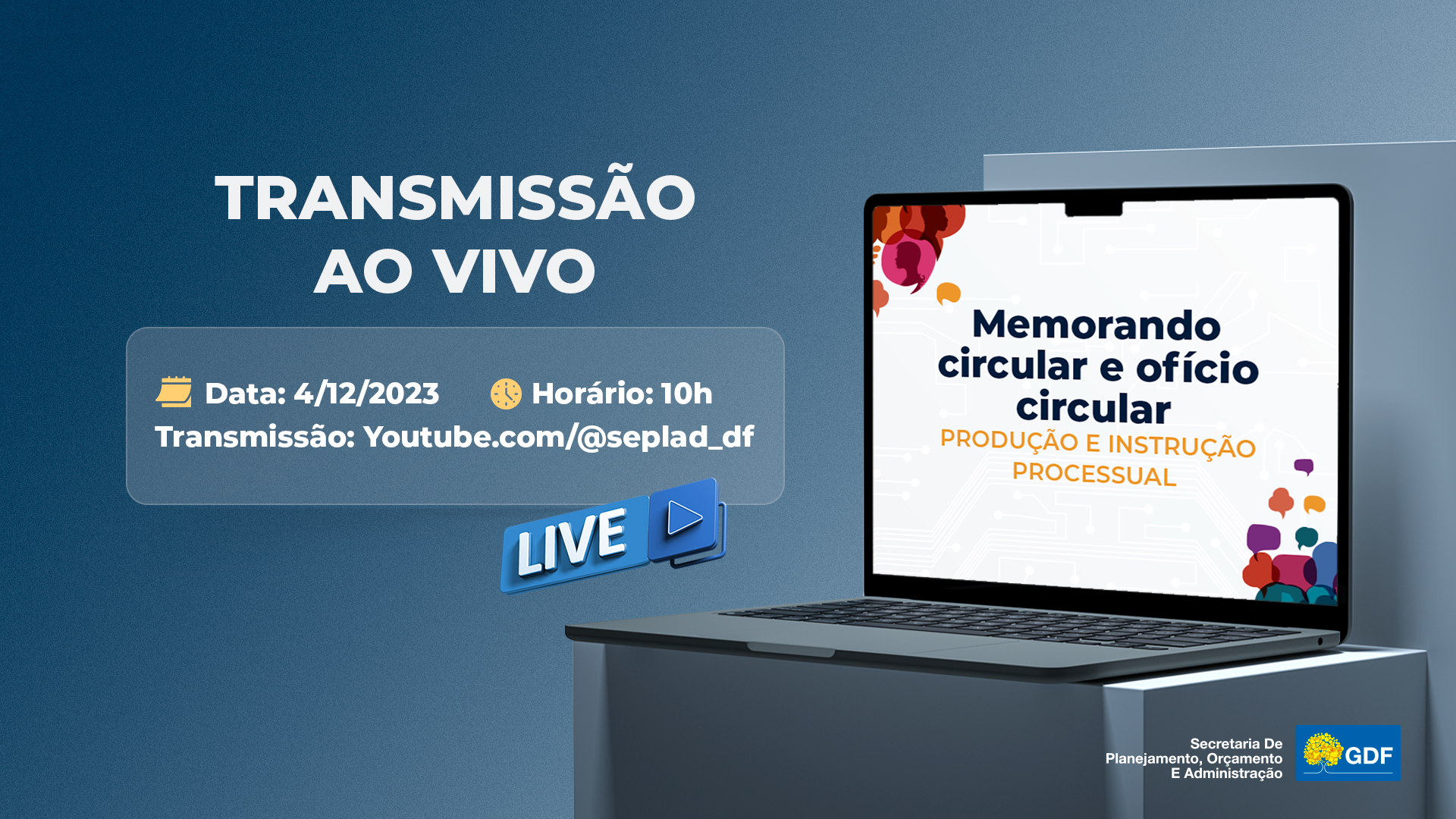 Na próxima-segunda-feira (4), acontece mais uma live nas redes da Secretaria de Planejamento, Orçamento e Administração (Seplad). Desta vez, a transmissão tem por objetivo orientar quanto ao passo a passo para elaborar e tramitar documentos destinados a diferentes órgãos e unidades. O foco será o Manual de Comunicação Oficial do GDF e o Sistema Eletrônico de Informações (SEI-GDF).
